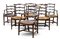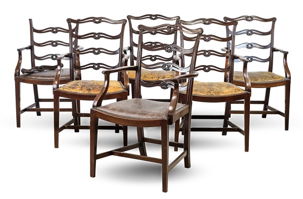 Gruppo di sei poltrone in mogano con schienale a giorno e traverse sagomate e t