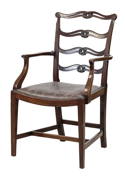 Gruppo di sei poltrone in mogano con schienale a giorno e traverse sagomate e traforate, sedute in pelle (difetti e restauri)
