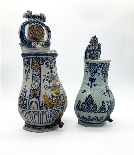 Manifattura di Delft, secolo XVIII-XIX. Due fontanelle da parete in maiolica co