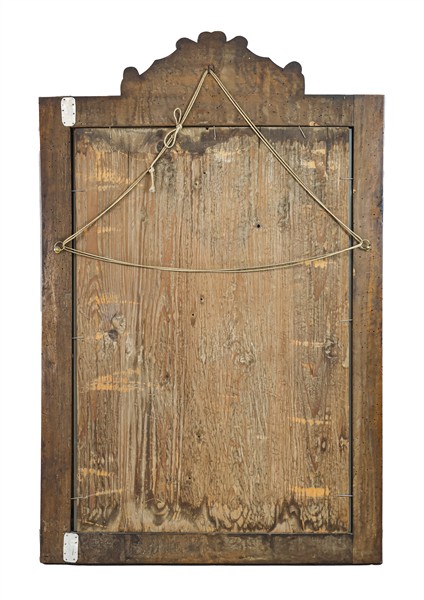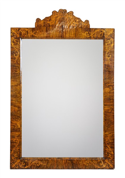 Specchiera con cornice sagomata e impiallacciata in legni di varie essenze, decori ad intarsio a volute contrapposte. Secolo XIX (cm 110x72) (difetti)