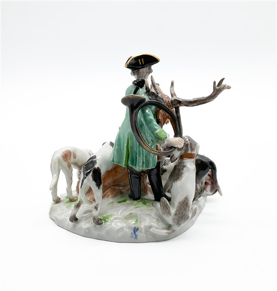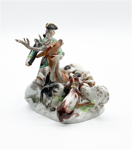Manifattura di Meissen, secolo XIX. Da un modello di J.J. Kaendler. Gruppo di caccia con cervo e cani in porcellana dipinta in policromia e tracce di doratura. Marcato in blu al retro, numerale 2706 154 incusso sotto la base (cm 15x14) (difetti e piccoli restauri)