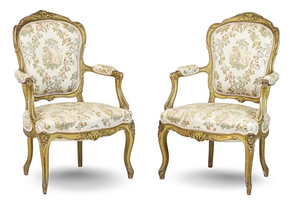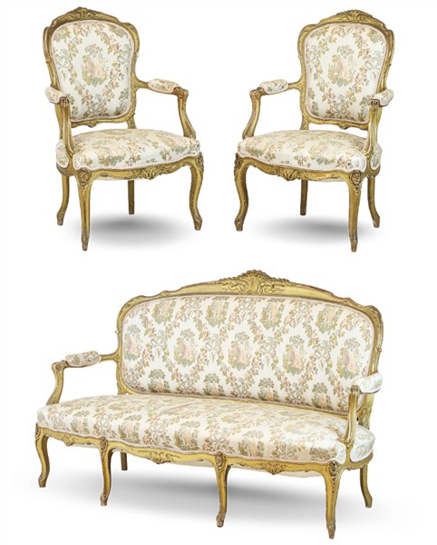Fornitura da salotto in legno intagliato e dorato composta da divano e coppia di poltrone decorati nella cimasa e nel grembiale a motivi floreali (l max cm 170) (difetti)