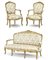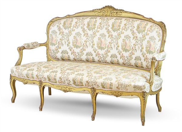 Fornitura da salotto in legno intagliato e dorato composta da divano e coppia d