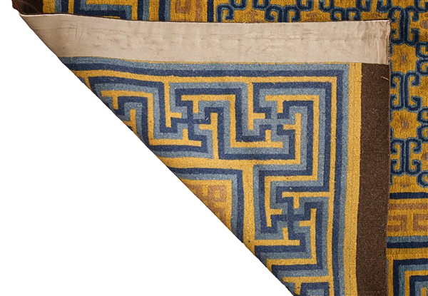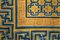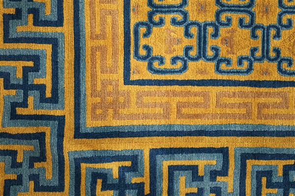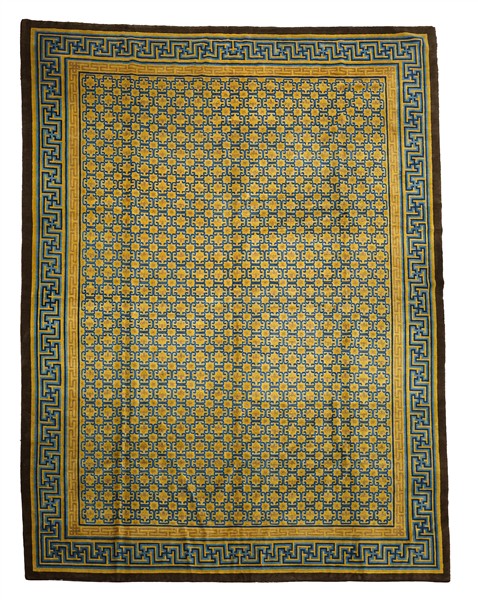 Tappeto Nepal, recente manifattura. Decoro a griglia azzurro e blu su fondo giallo (cm 350x340) (difetti e tagli)