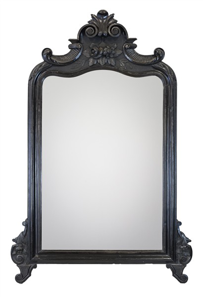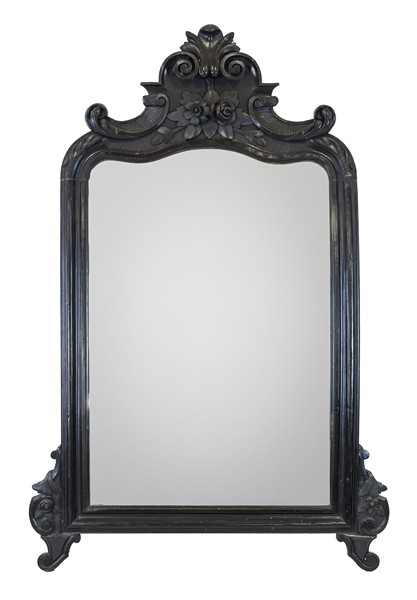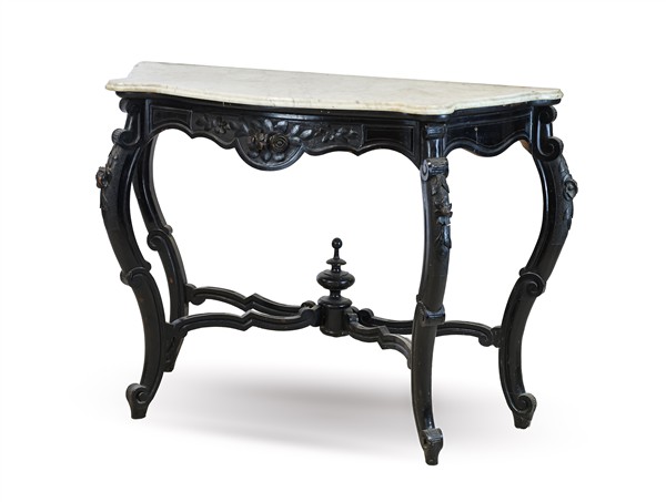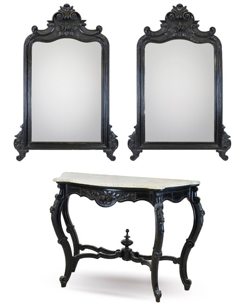 Lotto composto da console e coppia di specchiere in legno intagliato ed ebanizzato, console con gambe mosse raccordate da crociera e piano in marmo sagomato (cm 130x95x54) e specchiere sagomate di stesso decoro. Fine secolo XIX (cm 178x116) (difetti)