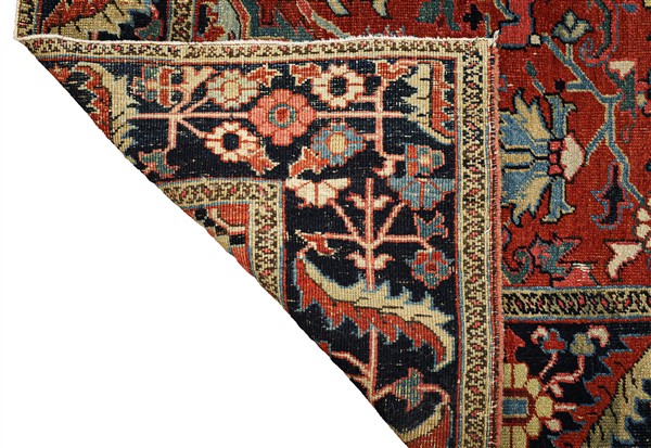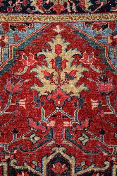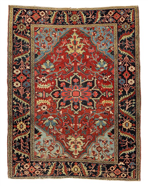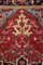 Tappeto Heritz, Persia, fine secolo XIX. Decoro con medaglione stellato a fondo blu notte e rosa su campo rosso ornato da rami fioriti. Angolari a fondo azzurro. Grande bordura principale a meandro su fondo blu notte (cm 185x148) (difetti)