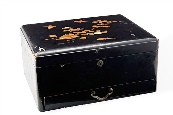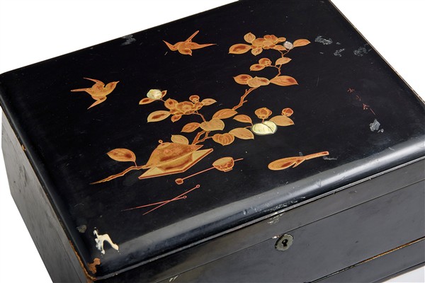 Scatola per scrivere laccata nera (suzuribako), la cui copertina è decorata in hira maki-e con utensili per la cerimonia del tè e uccelli, impreziosita da intarsi in madreperla e firmata sul coperchio. L'interno in lacca nashiji contiene due vassoi rimovibili con scomparti e rivela un'apertura del cassetto nella sezione inferiore. Giappone, periodo Meiji (1868-1912) (cm 29x14x22) (difetti e mancanze)