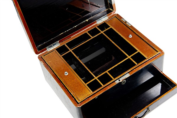 A black lacquer writing box (suzuribako), the cover decorated in hira maki-e with tea ceremony utensils and birds, embellished with mother-of-pearl inlay and signed on the lid. The interior in nashiji lacquer contains two removable trays with compartments and reveals a drawer opening at the lower section. Japan, Meiji period (1868-1912) (cm 29x14x22) (defects and losses)