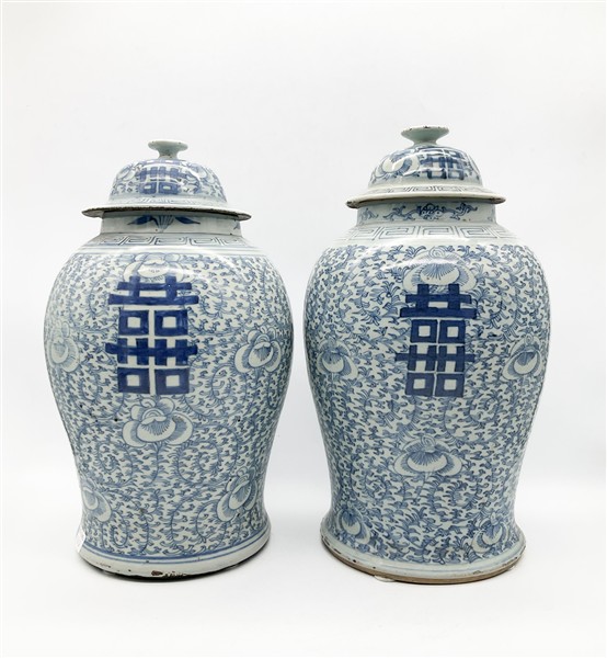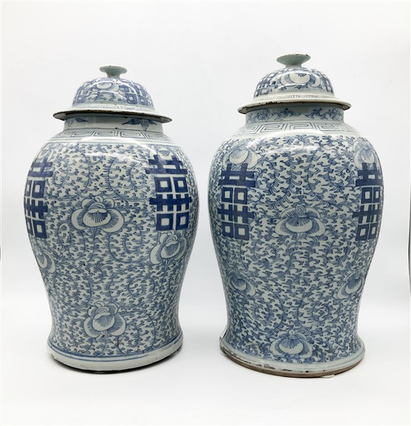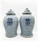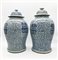 Coppia di potiche con coperchio in porcellana dipinta in monocromia blu.