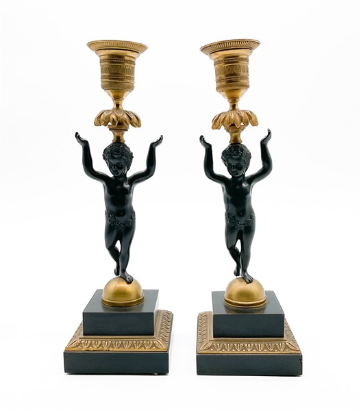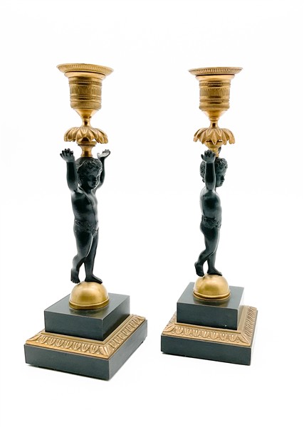Coppia di candelieri di gusto Impero in bronzo brunito e dorato con fusto a figura di putto a tutto tondo su base a plinto (h cm 24,5) (lievi difetti)