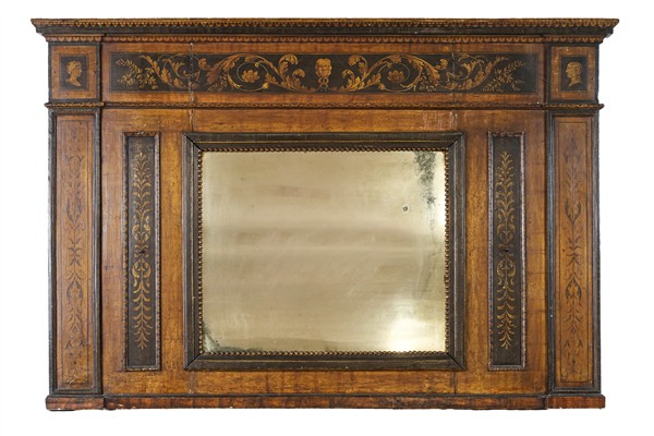Caminiera in legno dipinto con riserve decorate a volute fogliacee e profili, specchio rettangolare con bordura perlinata. Inizio secolo XIX (cm 152x96,5) (difetti)