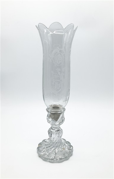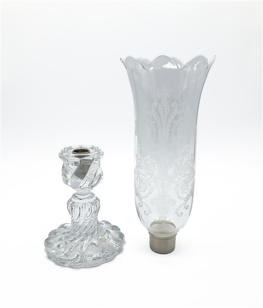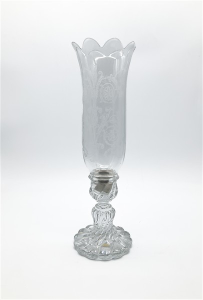 Portacandela in cristallo baccellato con paralume inciso a decoro di girali fogliacee. Marca a tampone sotto la base e nel paralume (h cm 40) (lievi difetti)