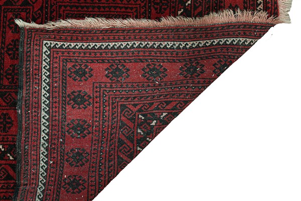 Tappeto Beluchistan, Persia, secolo XX. Decoro con quattro Gul uncinati nei toni del rosso, bianco e marrone racchiusi dentro riserve quadrate su campo color rosso rosato ed interni a numerose bordure particolarmente inusuali (cm 190x105) (difetti)