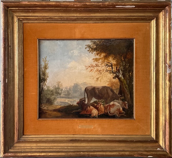 Jacob Philipp Hackert (attr.) "Armenti in un paesaggio" olio su tela (cm 27x3
