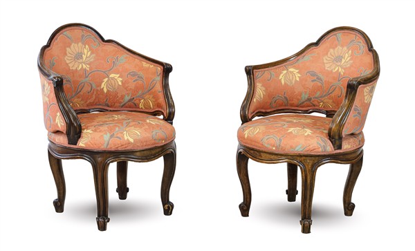 Coppia di poltroncine a pozzetto in noce con bordature scanalate e gambe terminanti a ricciolo (difetti)
