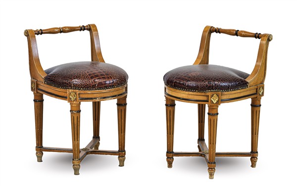 Coppia di sgabelli in stile Luigi XVI con schienale a giorno e seduta rivestita in pelle finto coccodrillo, gambe scanalate e rastremate riunite da traverse (h cm 60) (difetti)