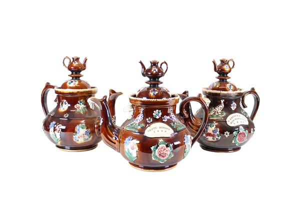 Gruppo di tre teiere in ceramica Bargeware a fondo marrone decorate in rilievo in policromia a scritte, volatili e fiori sparsi. Coperchi con prese a teiera a tutto tondo. Inghilterra, seconda metà del secolo XIX (h cm 30) (difetti)