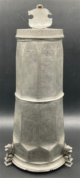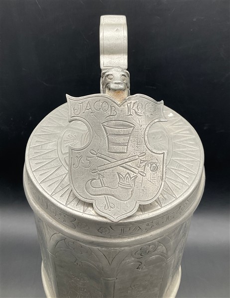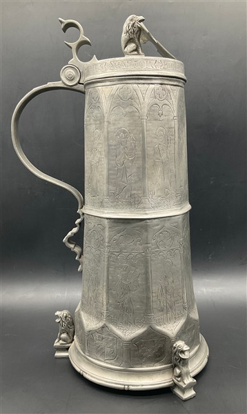 Da Jacob Koch. Grande tankard in peltro riccamente inciso con figure di Santi entro cartigli intervallati da colonne e stemmi araldici alla base, piedi a leoni a tutto tondo, manico sagomato, presa del coperchio sormontata da leone che regge tra le fauci uno stemma con simboli, firma e data "1570" (h cm 54) (difetti)