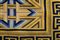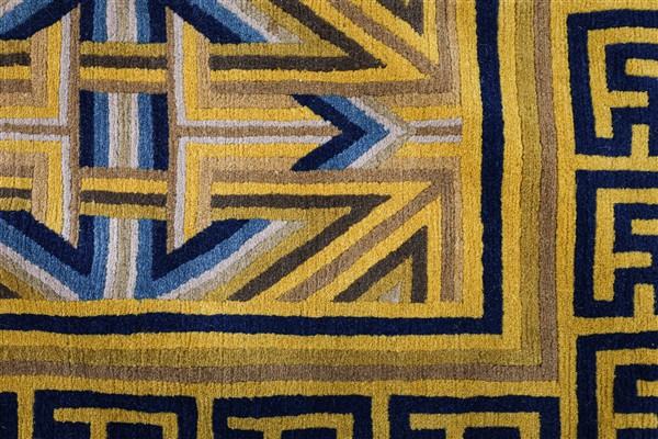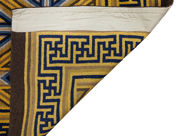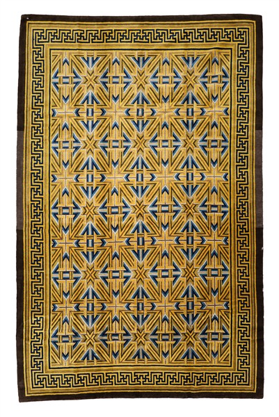Tappeto Nepal, recente manifattura. Decoro a griglia nei toni dell'azzurro, blu e bianco, giallo, marrone e nocciola (cm 343x222) (difetti e rapature)