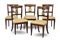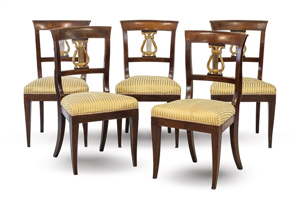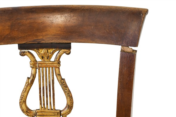 Gruppo di cinque sedie in noce con schienale a giorno centrato da cartella a lira dorata, gambe a sciabola. Inizio secolo XIX (difetti)