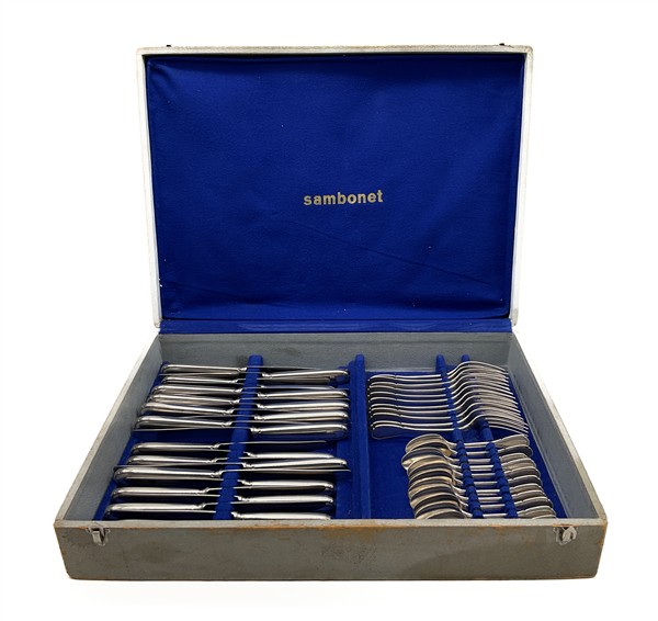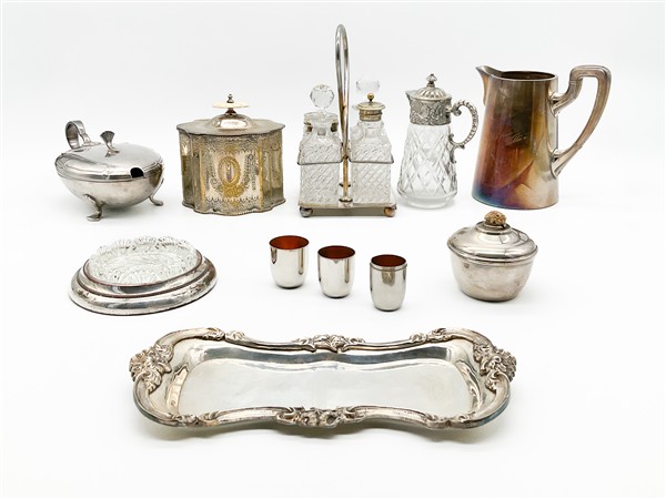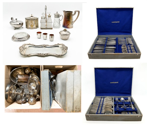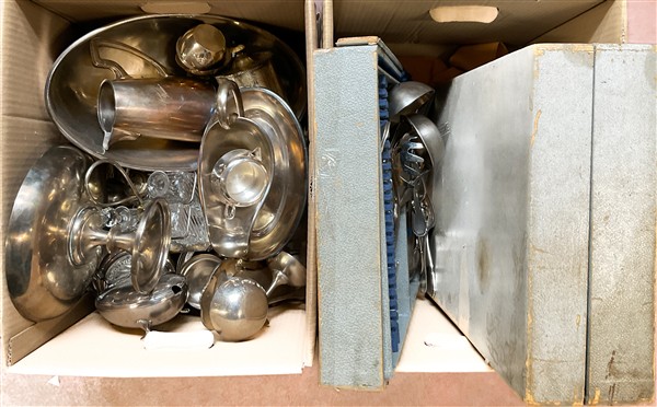 Due cartoni contenenti numerosi oggetti in metallo argentato, vetro e altri mat