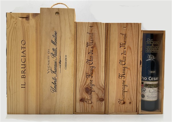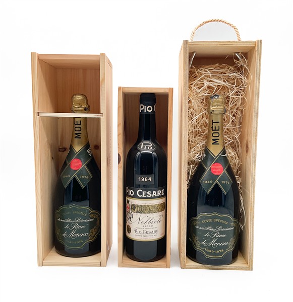 Lotto composto da quattro bottiglie di champagne di cui due Krug e due Moët & Chandon oltre ad una bottiglia di Nebbiolo Pio Cesare del 1964. Casse lignee non pertinenti (difetti)