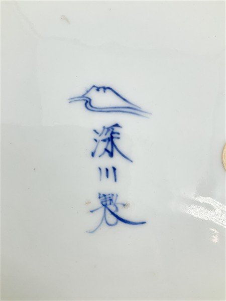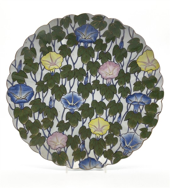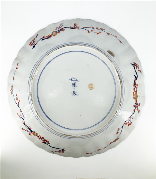 Grande piatto a profilo mistilineo in porcellana dipinta in policromia e dorata con decoro a fiori e calendole. Giappone, fine secolo XIX. Marcato al retro (d. cm 46) (difetti)