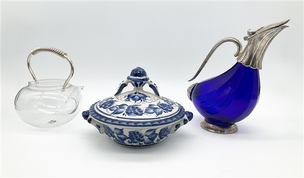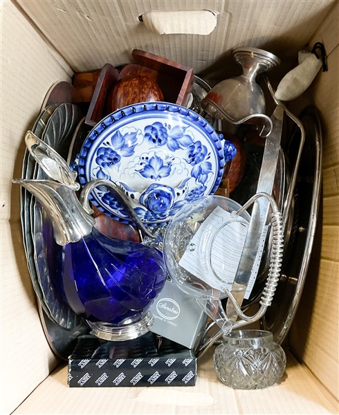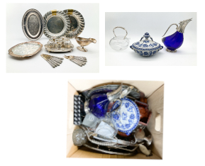 Cartone contenente numerosi oggetti diversi in materiali tra cui metallo, ceramica e vetro (difetti)