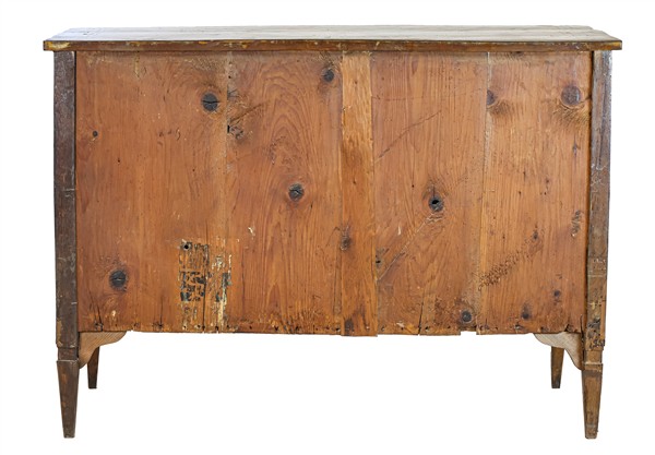Cassettone lastronato filettato e intarsiato in noce e legno chiaro, fronte a tre cassetti intarsiati a figure e motivi fogliacei. Piano e fianchi centrati da rosoni, piedi a obelisco rovesciato. Lombardia, inizio secolo XIX (cm 125x90x57) (difetti)