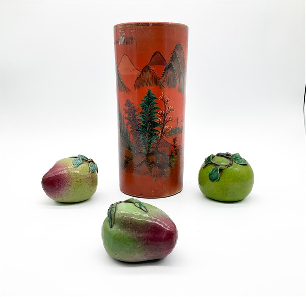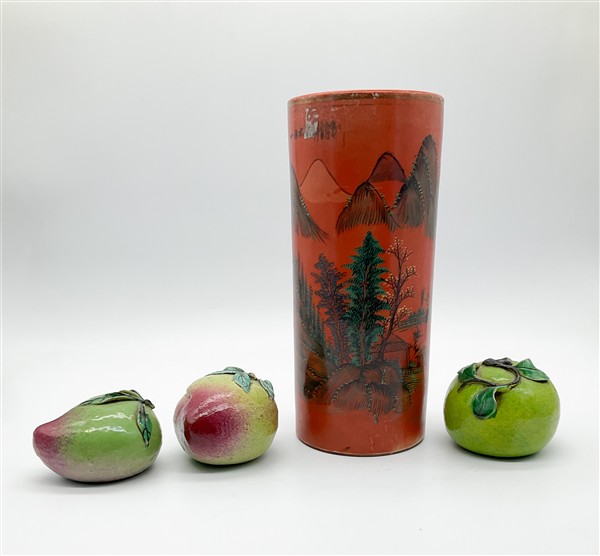 Manifatture orientali. Lotto composto da tre modelli di frutti ed un vaso in po