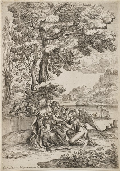 Lot consisting of an etching by Giuseppe Longhi depicting the portrait of Baron Bruder (the sheet 260x196 mm; inscribed, perhaps signed, "G. Longhi" at the bottom right) and an etching by Giovanni Francesco Grimaldi depicting the rest during the flight into Egypt (the impression 314x220 mm).