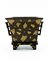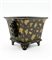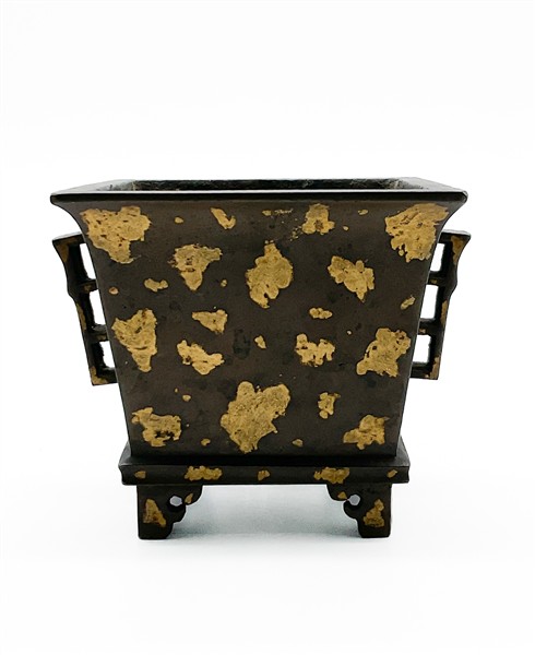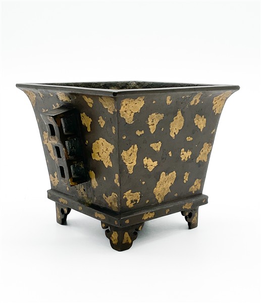 Incensiere biansato in bronzo spruzzato d'oro. Sollevato su quattro supporti angolari presenta una coppia di manici ad anello angolari traforati. L'esterno è decorato da spruzzi irregolari d'oro