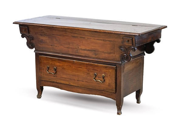 Madia in noce filettata in legni vari con piano ribaltabile e due tiretti laterali, un cassetto alla base e piedi mossi. Secolo XIX (cm 137x77x58) (difetti e restauri)
