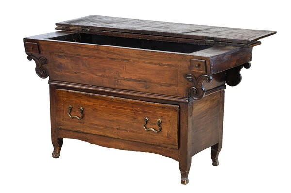 Madia in noce filettata in legni vari con piano ribaltabile e due tiretti later