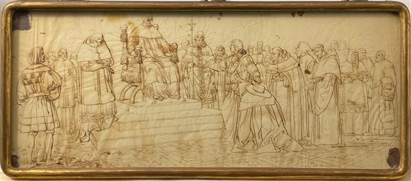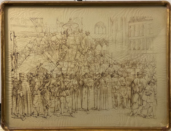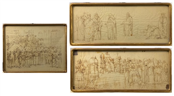Gruppo di tre disegni a china su carta raffiguranti "Scene veneziane con doge e prelati"