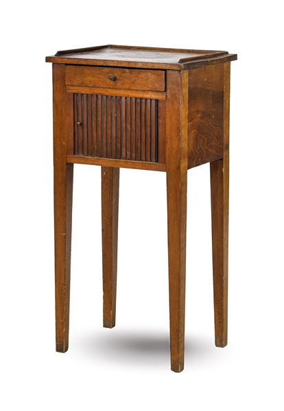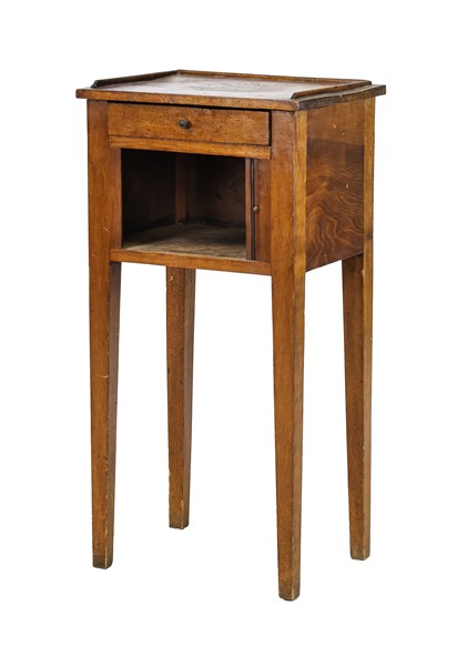 Comodino in noce con fronte a un cassetto e serrandina, alte gambe rastremate. Secolo XIX (cm 33x85x43) (difetti e rotture)