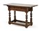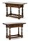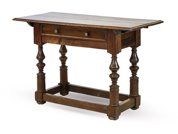Due tavoli da parete in legni vari con gambe tornite raccordate da traverse, un
