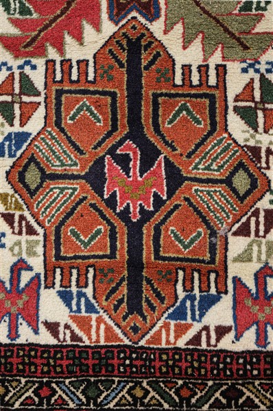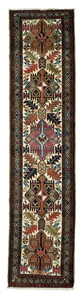 Tappeto passatoia rumeno, secolo XX. Decoro con fila di medaglioni geometrici stilizzati su fondo bianco (cm 288x68) (difetti)