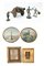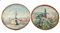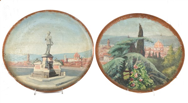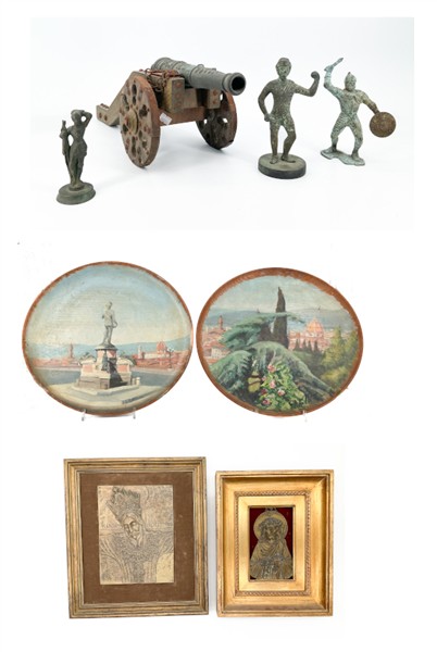 Lotto composto da un modellino di cannone, due placche metalliche religiose in cornici, tre figurette in metallo e due piatti da parete in legno dipinto con vedute fiorentine firmate e datate (d max cm 38) (difetti)