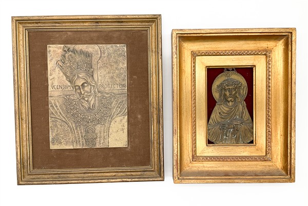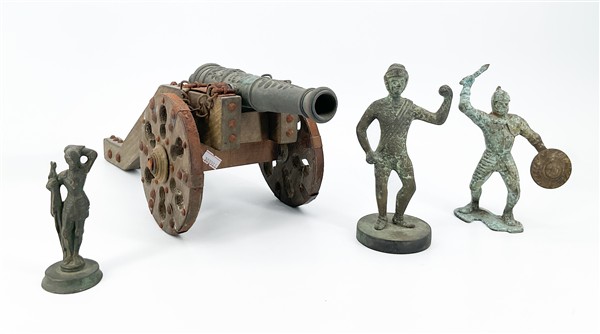 Lotto composto da un modellino di cannone, due placche metalliche religiose in