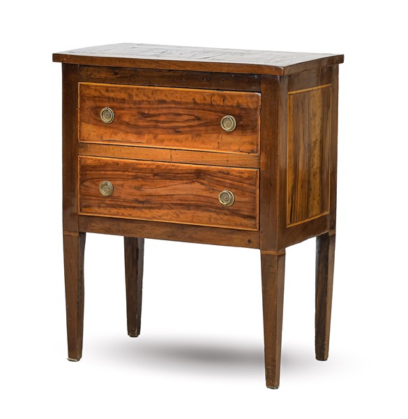 Antico mobiletto in legni vari con filettature, fronte a due cassetti e gambe r