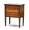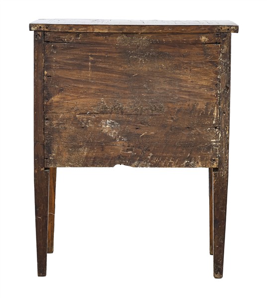 Antico mobiletto in legni vari con filettature, fronte a due cassetti e gambe rastremate (cm 61x76x36,5) (difetti)