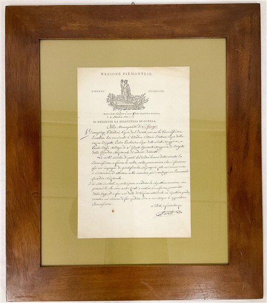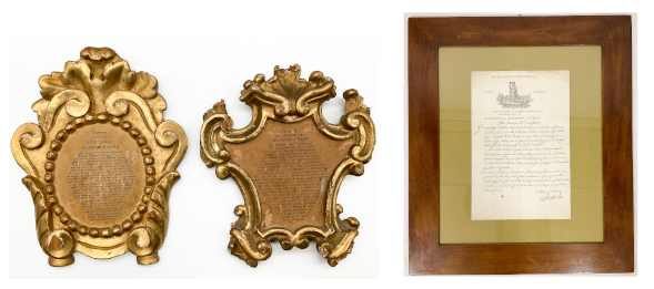 Lotto composto da due piccole cartagloria in legno intagliato e dorato, secolo XVIII-XIX (cm max 26x21) ed una grida piemontese datata 1800 (cm 35x23) in cornice (difetti)