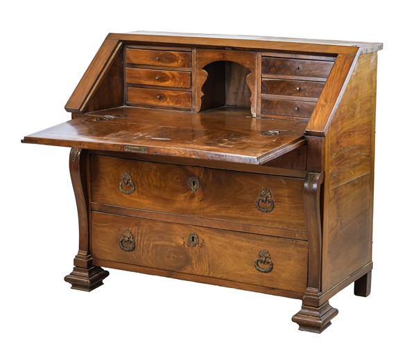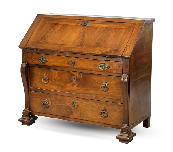 Ribalta lastronata in noce con calatoia che rivela vano a giorno e sei tiretti, fronte a tre cassetti di cui uno a mezza altezza, montanti sagomati e guarnizioni in metallo. Secolo XIX (cm 115x105x57) (difetti)