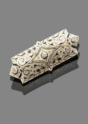 SPILLA Spilla in oro giallo e oro bianco con incastonati tre diamanti di vecchio taglio per complessivi ct 0,35 ca Piccoli zaffiri taglio carré e piccoli diamanti Peso gr 10,10 Periodo 1930 yellow and white gold brooch with three antique cut diamonds totaling about 0,35 kt, small asccher cut sapphiers and small diamonds. Weight 10.10 gr period 1930