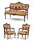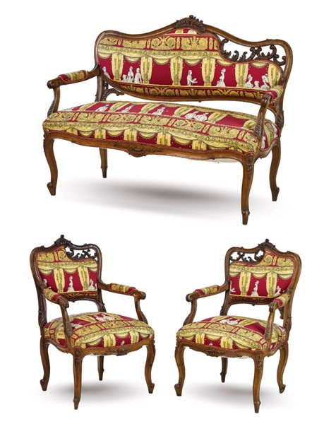 Salotto in stile barocchetto in noce intagliato composto da divanetto e coppia