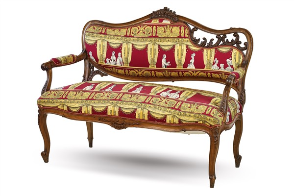 Salotto in stile barocchetto in noce intagliato composto da divanetto e coppia di poltrone con cimasa traforata, rivestimento in tessuto operato policromo Fornasetti (difetti)