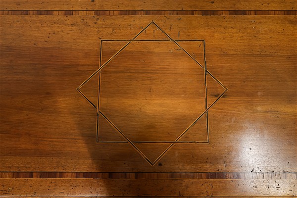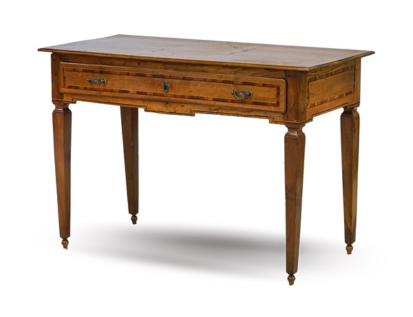 Scrittoio da centro in noce filettato in legni vari, fronte a un cassetto e gambe ad obelisco rovesciato. Fine secolo XVIII (cm 109x76x53) (difetti)