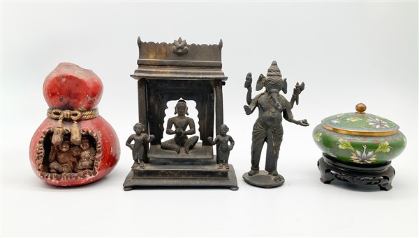 Manifatture orientali, secolo XIX/XX. Lotto composto da quattro oggetti diversi di decorazione tra cui una figura di Ganesha in bronzo un tempietto indiano (h max cm 20)