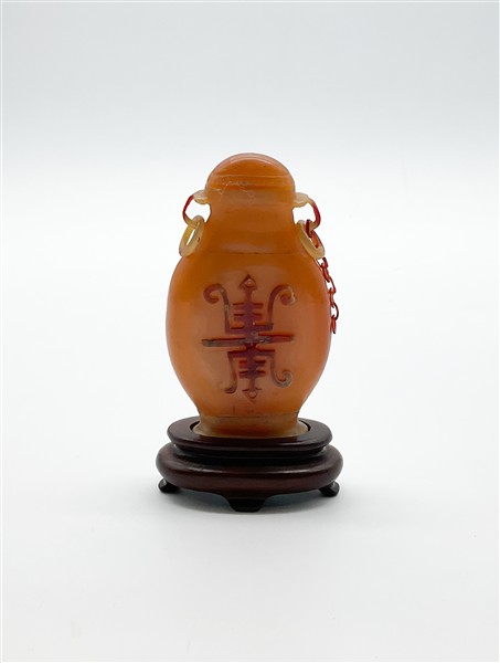Vasetto in corno color ambra scolpito con figura orientale ed un albero sul rec